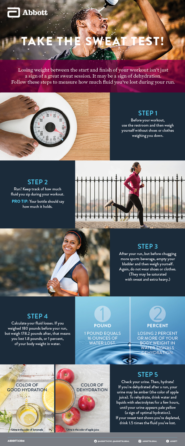 No matter your age or training status, though, the sweat test can provide a very accurate measure of your overall fluid and electrolyte losses. To perform the sweat test, simply weigh yourself before and after exercising. Ideally, do this after having emptied your bladder and without shoes or clothes on to obtain the most accurate measurement possible.