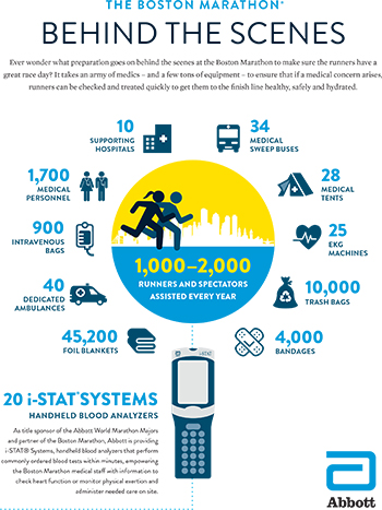 It's a place no Boston Marathoner intends to end up: The medical tent. Luckily for runners, an unexpected visit means the expert care of 1,700 volunteers ready to tackle nearly any emergency with hundreds of beds, I.V.s, ice packs, and monitors. Among their most efficient tools? A small handheld device that could produce life-saving results: Abbott's i-STAT technology.
