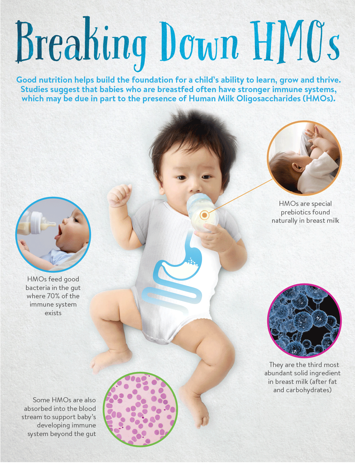 Simply, they help the good bacteria do the good things you want in your baby's gut. 2'-FL HMO also travels through the bloodstream.